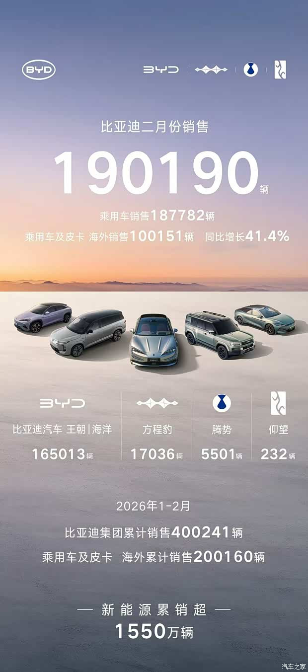 [汽车之家资讯]3月1日,咱们从官方获悉,比亚迪2月份销量为190190辆,乘用车销量为187782辆,比赛下注app官网乘用车及皮卡外洋销售100151辆,同比增长41.4%。具体信息如下: