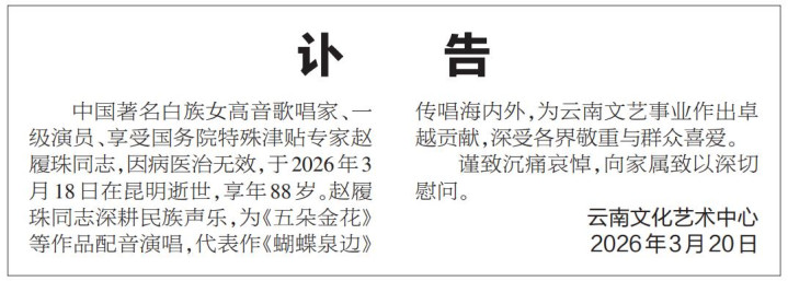 中国有名白族女高音讴颂家、国度一级演员、享受国务院特别津贴行家赵履珠同道,因病医治无效,于2026年3月18日在昆明骤一火,享年88岁。