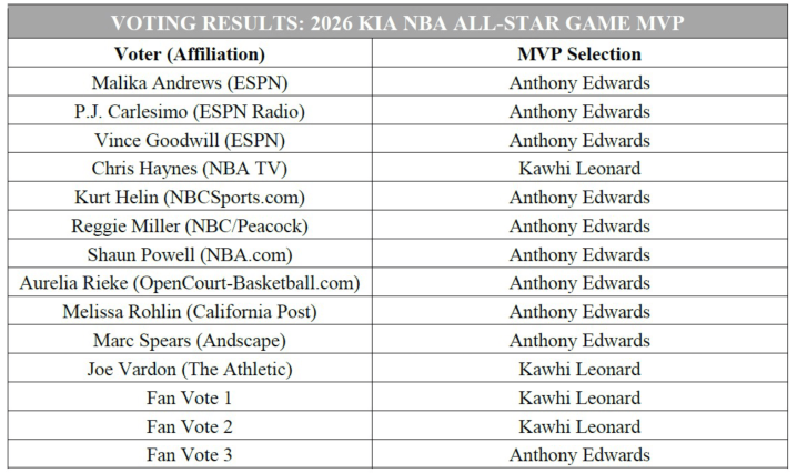 本次全明星MVP投票由11位媒体记者和3位球迷代表构成,爱德华兹取得的10票里有9票来自媒体记者,1票来自球迷;伦纳德有2票来自媒体记者,2票来自球迷。