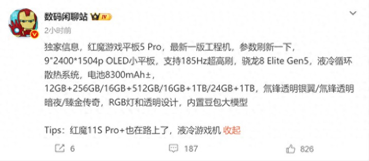 4月14日音讯,此前,红魔还是预热,将会推出游戏平板5 Pro,今天,博主@数码座谈站 曝光了新机的一些参数信息。