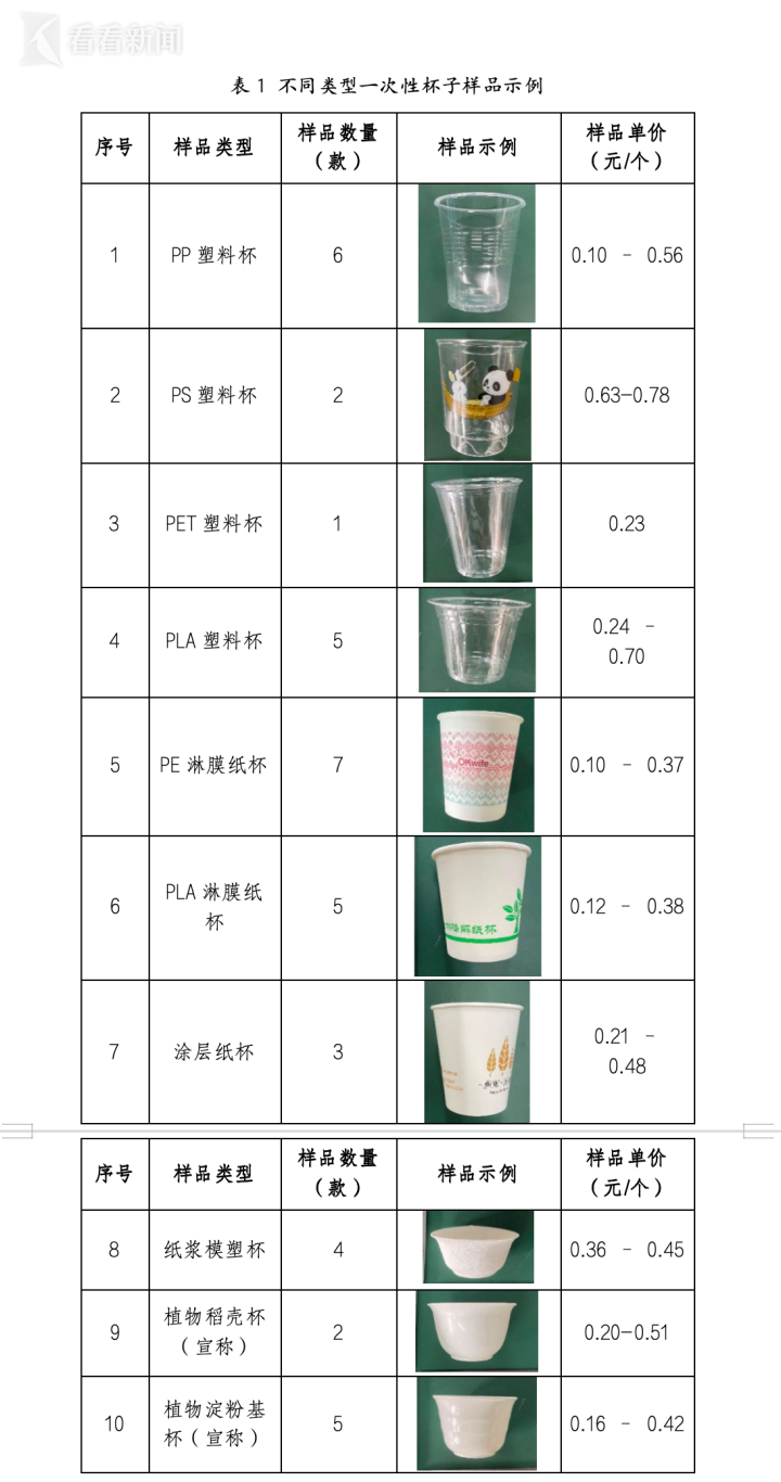 本次评测在电商平台及大型商超购买了40款一次性杯子,涵盖了常见的一次性塑料杯、一次性纸杯以及部分宣称为植物原料的杯子。具体分类见表1。