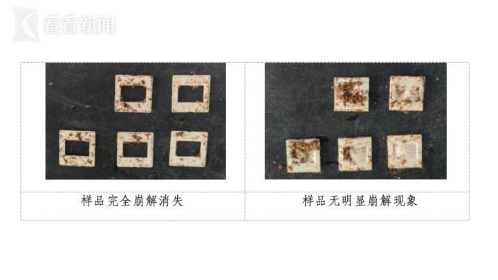 8、降解测试:模拟工业堆肥条件,随机测试10款宣称可降解的样品,其中7款崩解率达100%,可完全崩解消失;3款崩解率为0%,未发生任何明显的崩解现象。