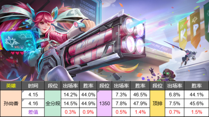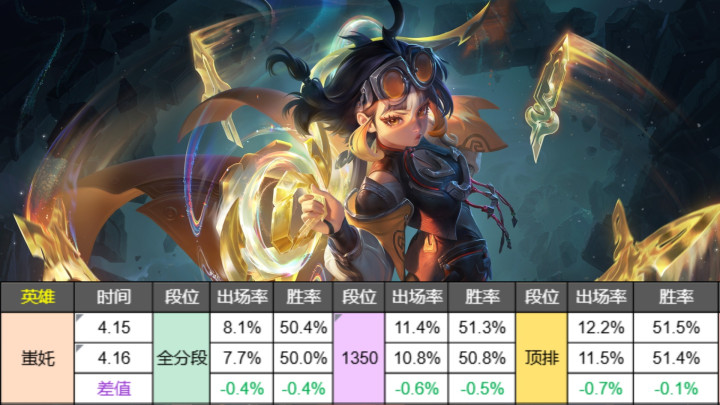 从末端来看,出场率波动不大,因为许多东谈主齐并不是很看好这个转机,胜率方面最高顶排涨幅1.5%还可以,但如若只是这样的数据,还够不上解脱泥坑的地步,各分段胜率 也曾是垫底的景况,我以为经营该在其他方面多奋勉一下,哪怕给二手段的破甲加多5%。